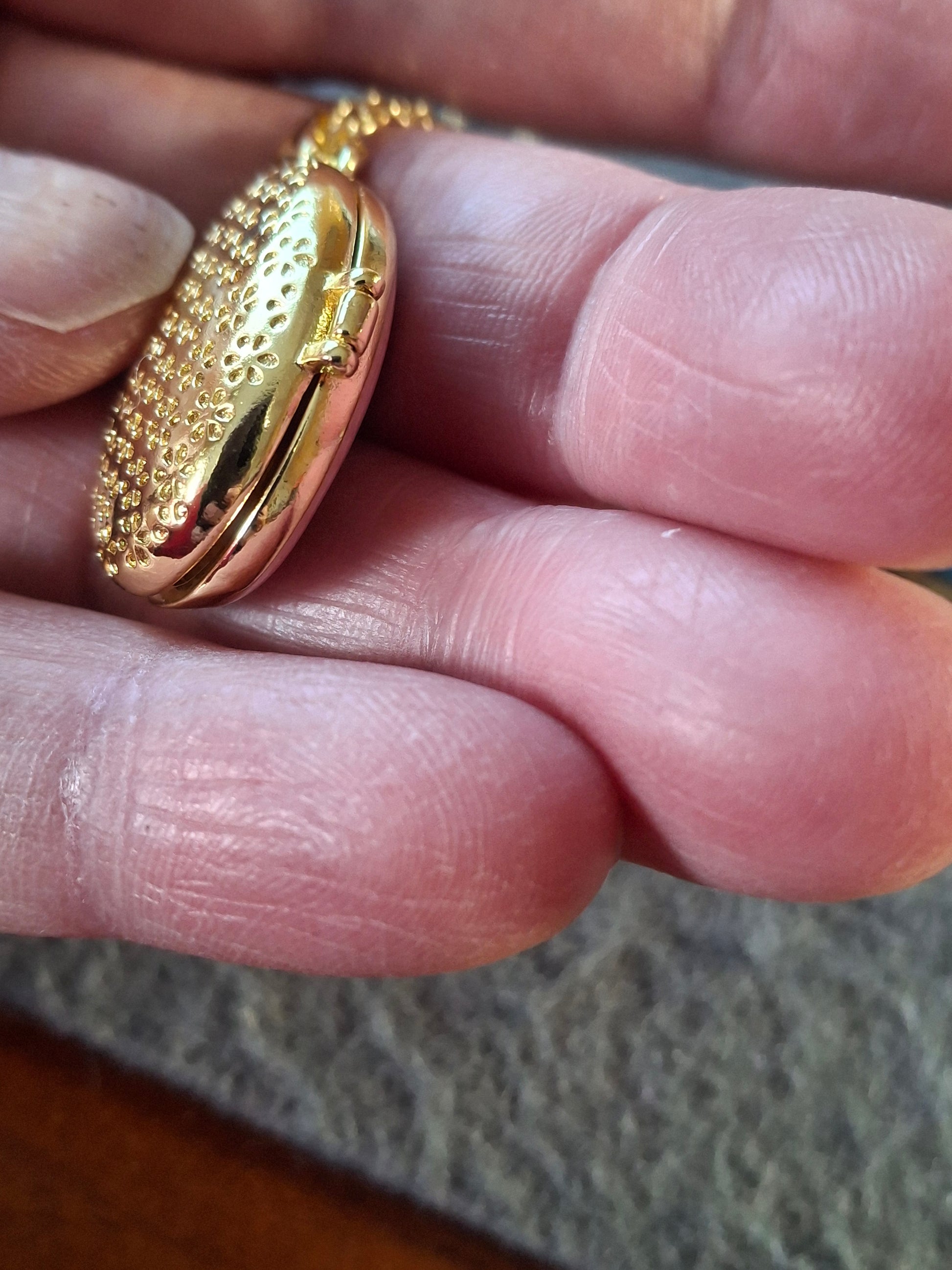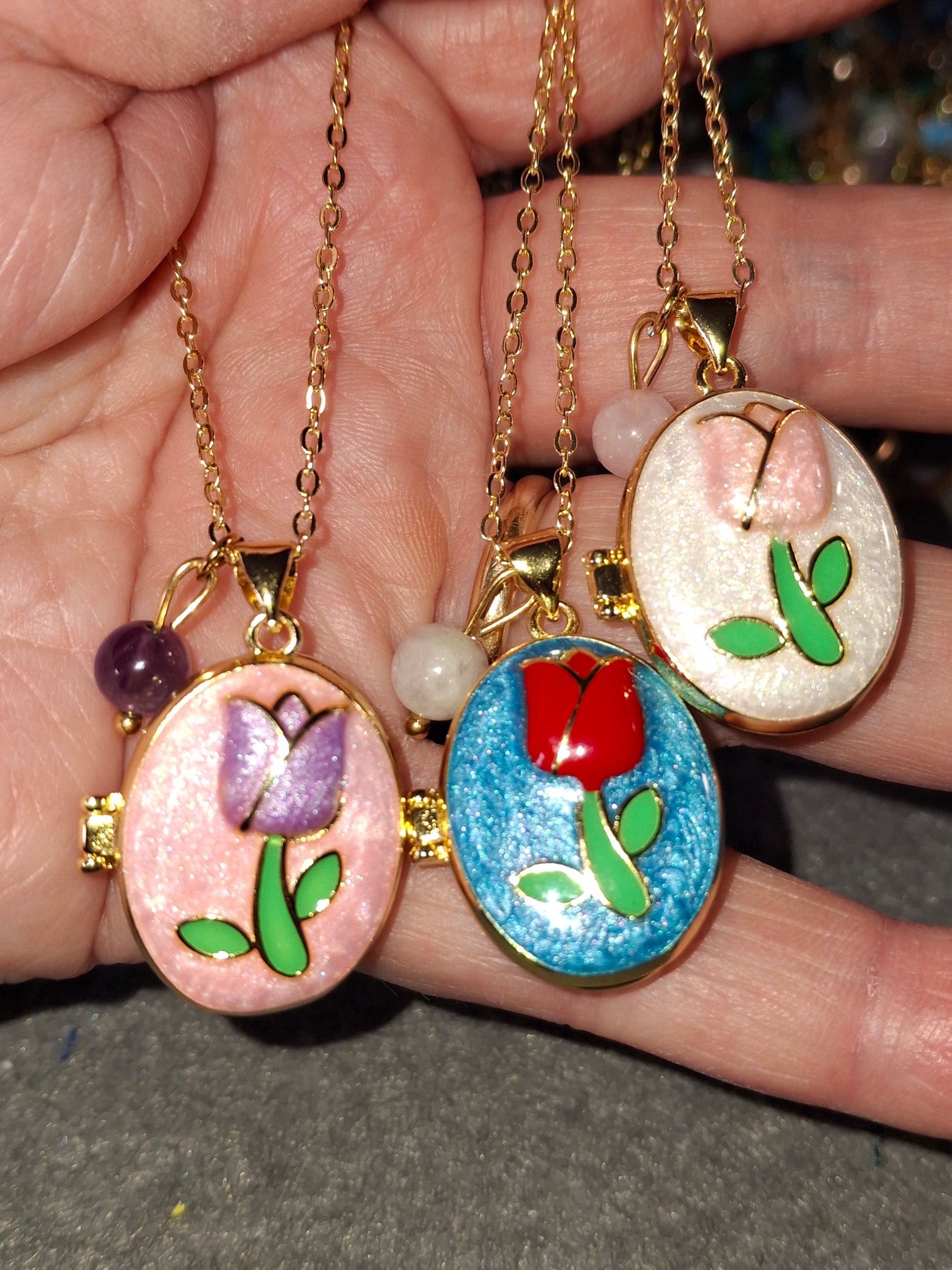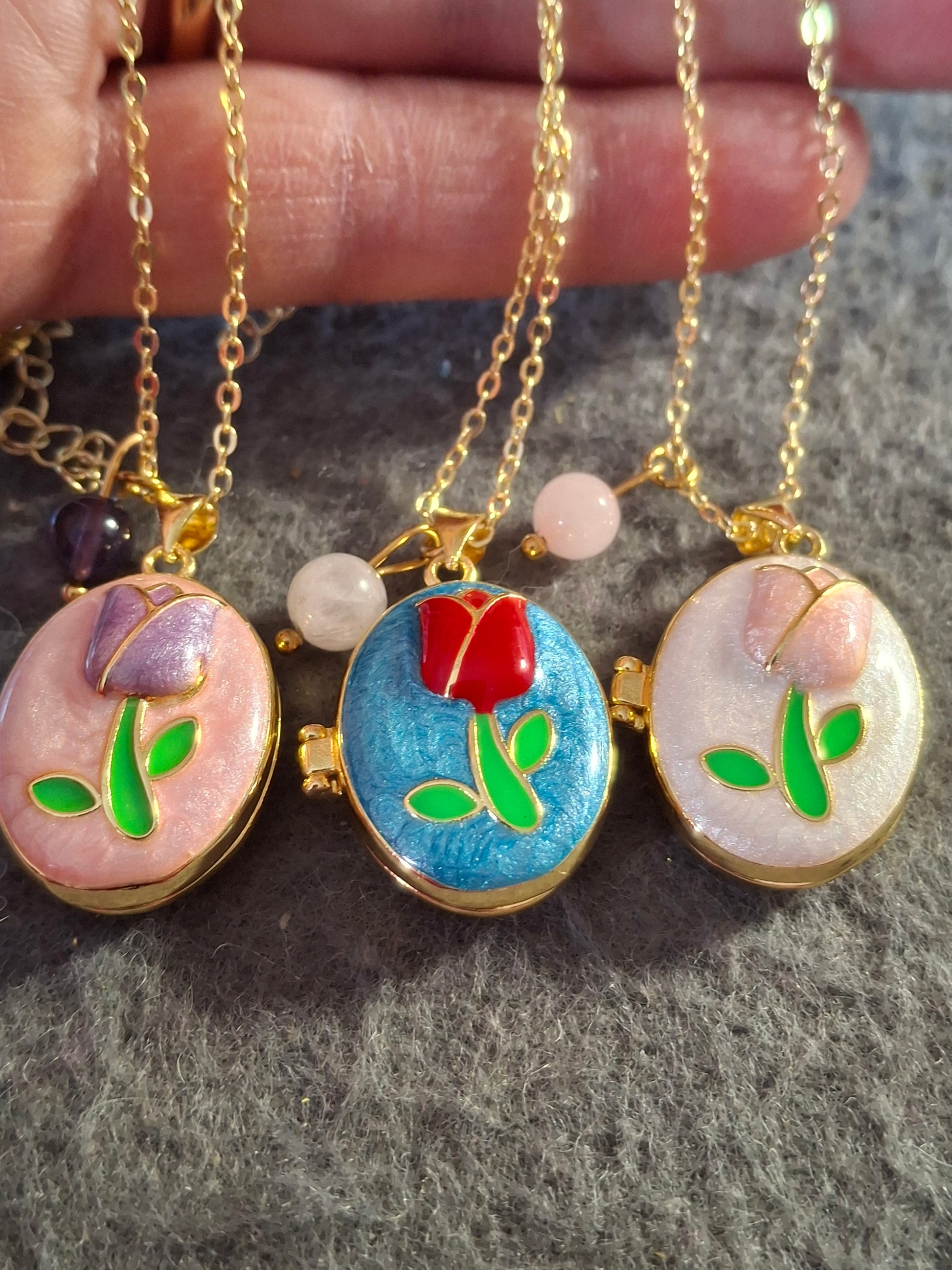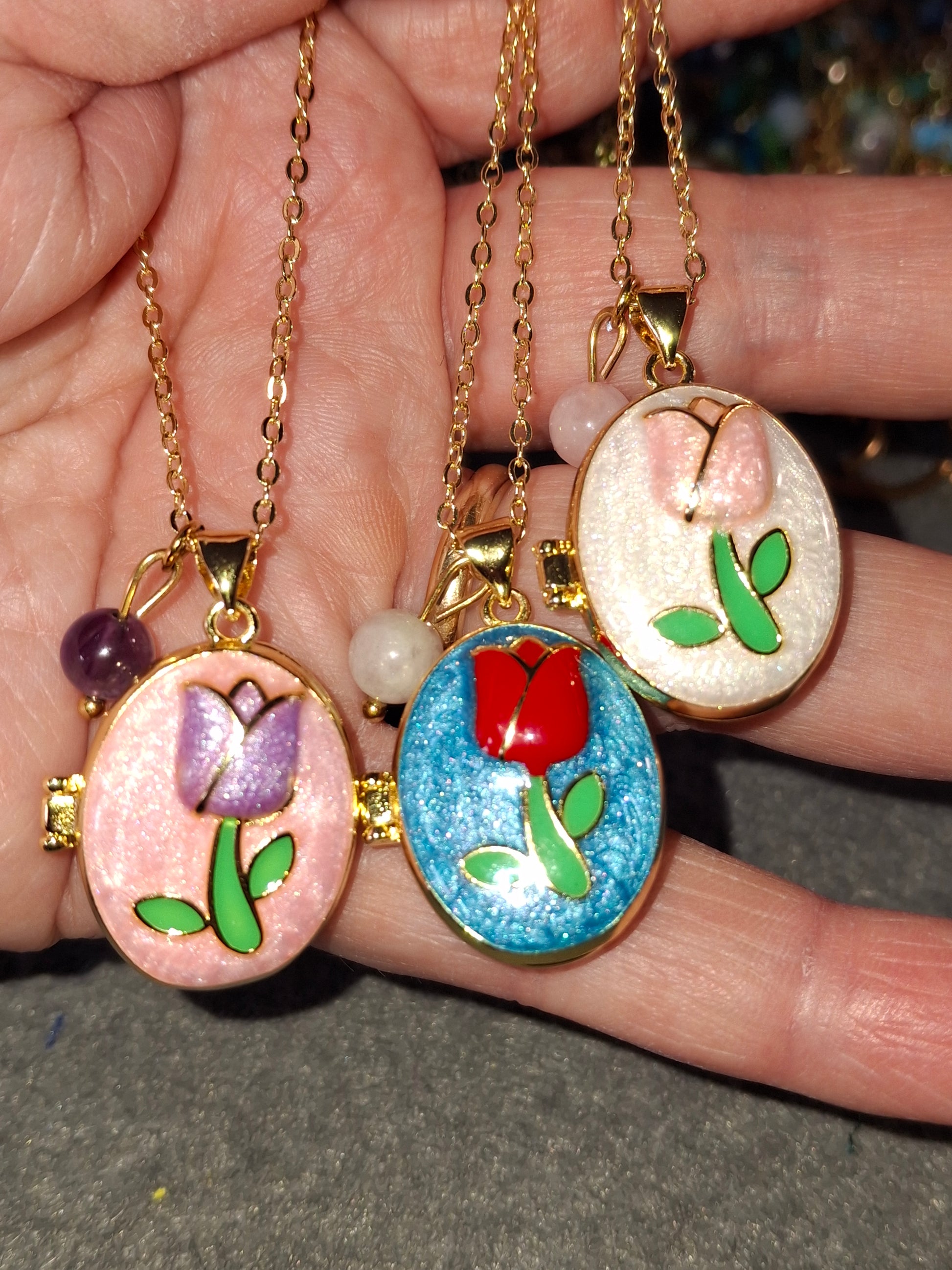 pendentif ovale porte photo en cuivre plaqué or 18K et email coloré sans nickel cadmium et plomb motif tulipe peinte à la main, dimensions hauteur sans bélière 25mm largeur 20mm, ouvert 43mm