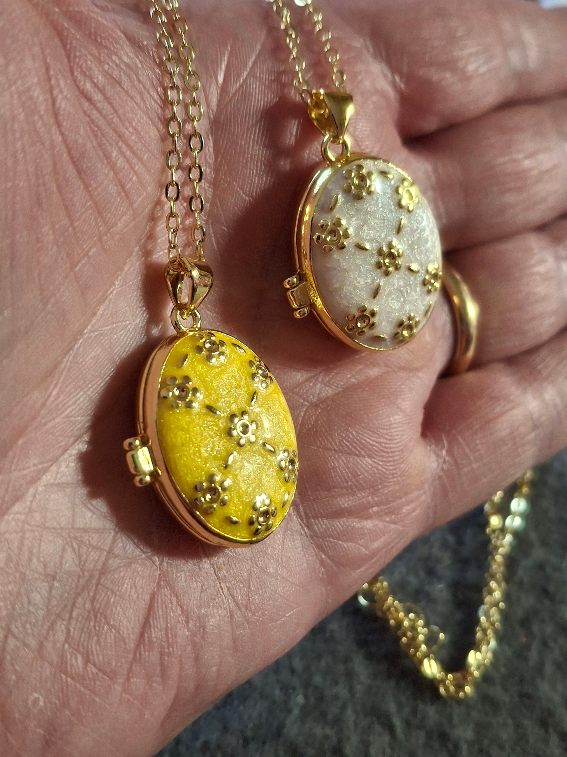 pendentif ovale porte photo en cuivre plaqué or 18K et email coloré sans nickel cadmium et plomb motif fleurs peintes à la main, dimensions hauteur sans bélière 25mm largeur 20mm, ouvert 43mm
