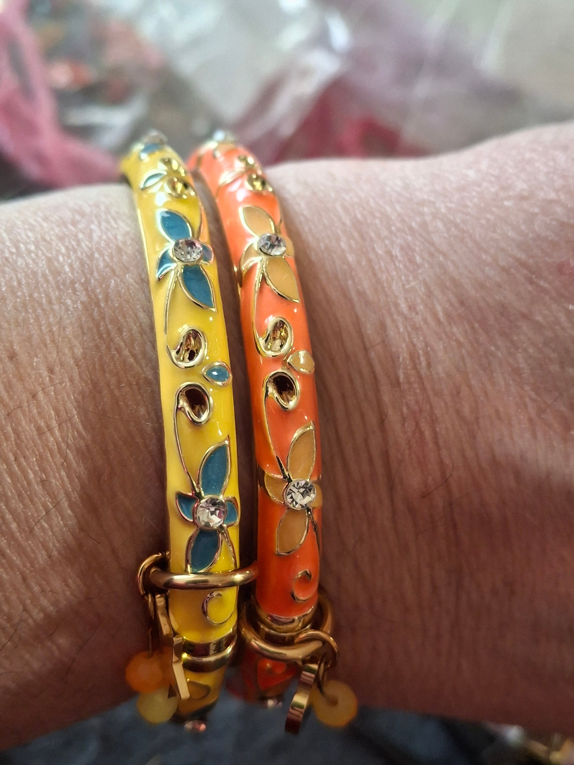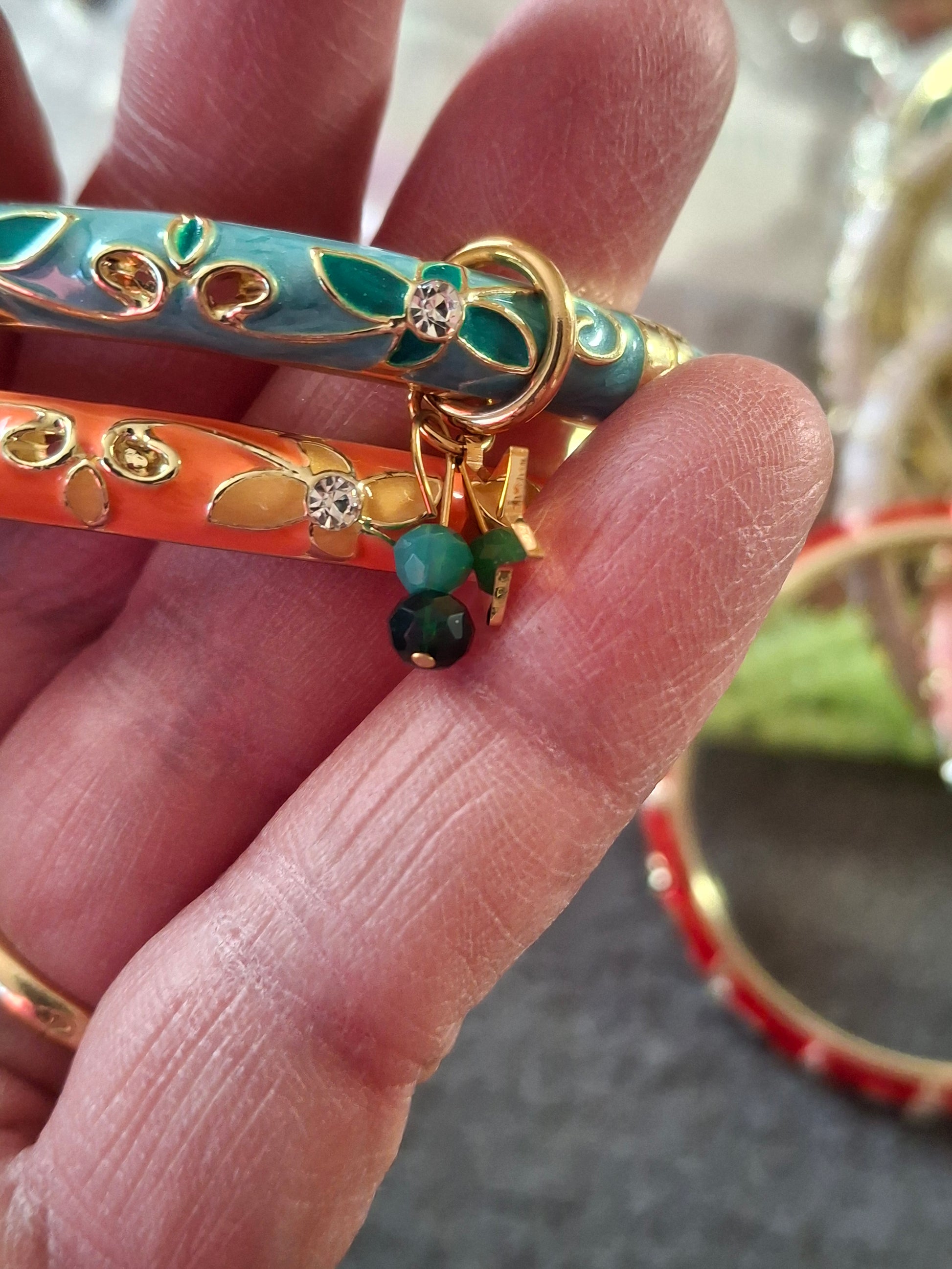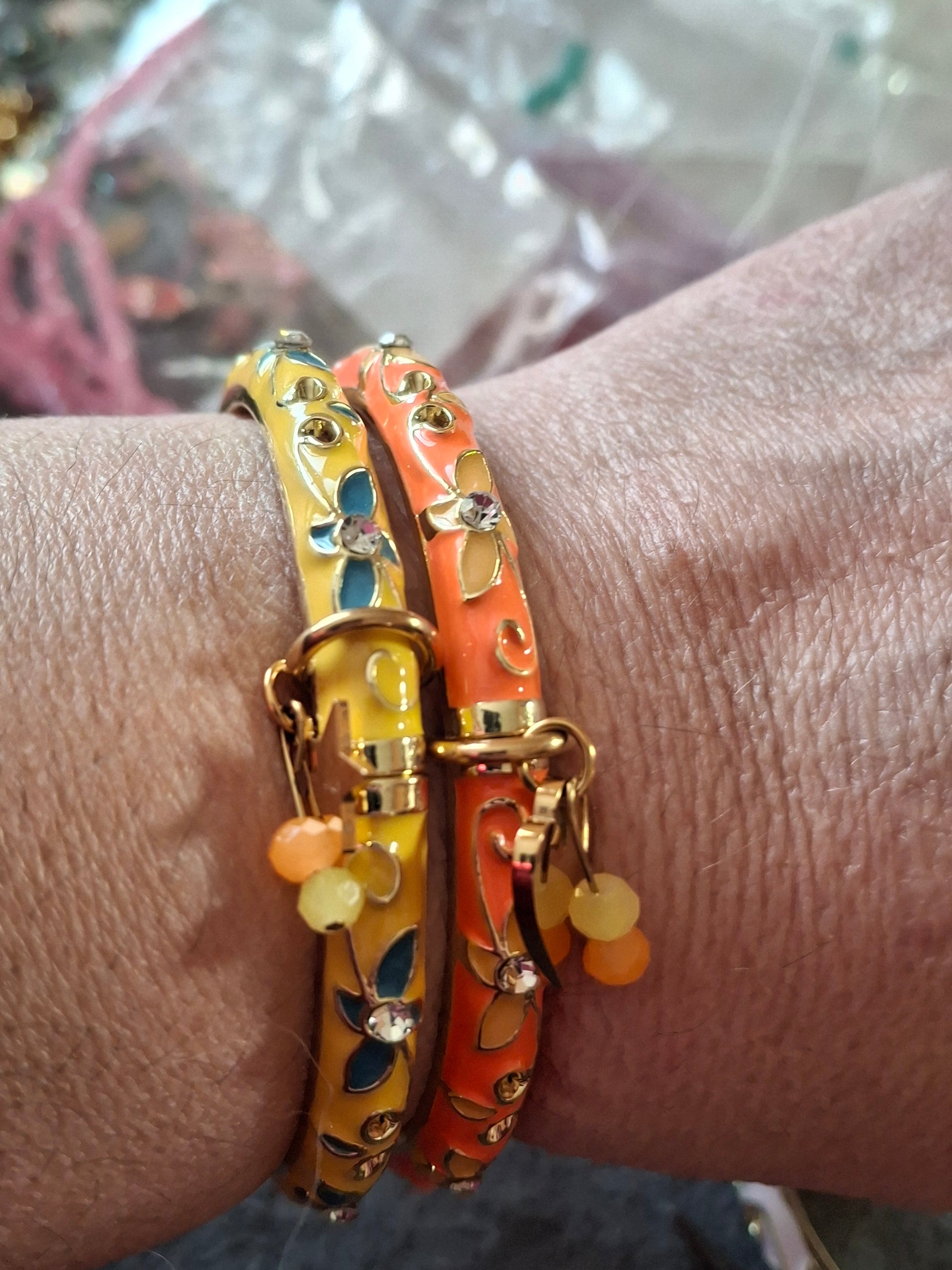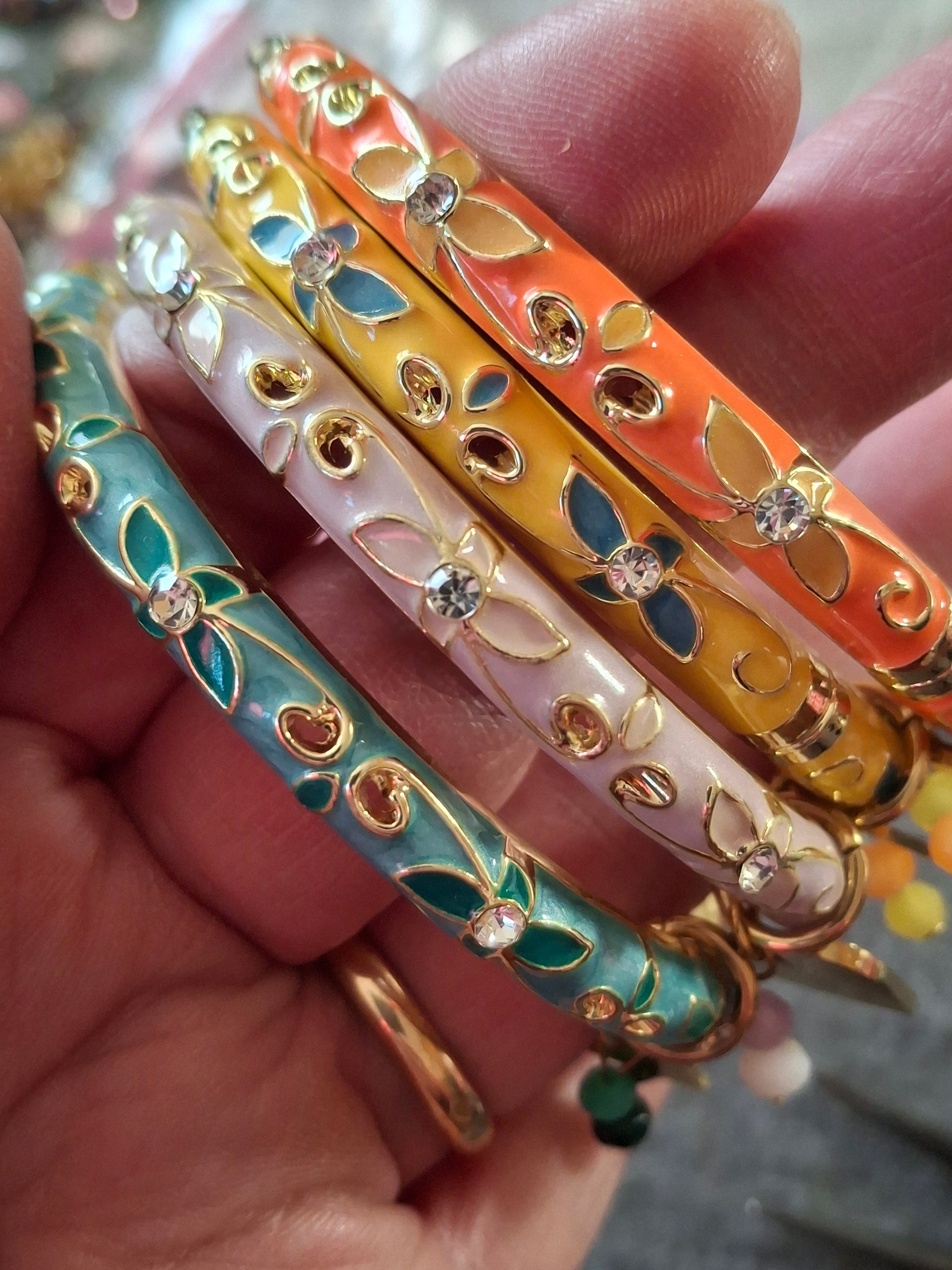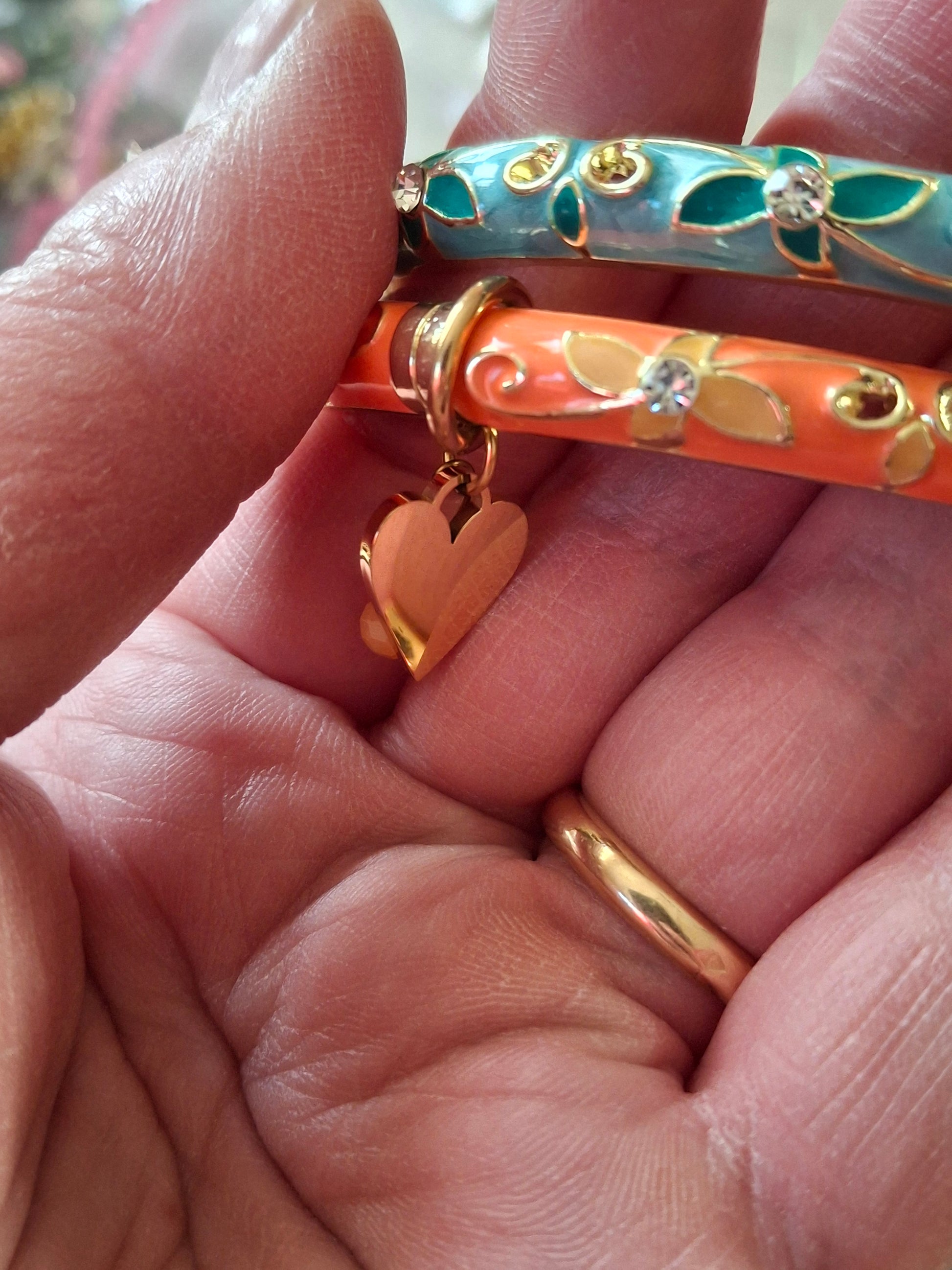 Très joli jonc rigide à ressort style bohème, en cuivre, laiton et email coloré motif petites fleurs et zirconium diamètre 57 mm environ breloques coeur ou étoile en acier inoxydable stainless steel 316 et perles à facettes colorées sans nickel cadmium et plomb ,les breloques peuvent se retirer facilement et se remettre facilement également