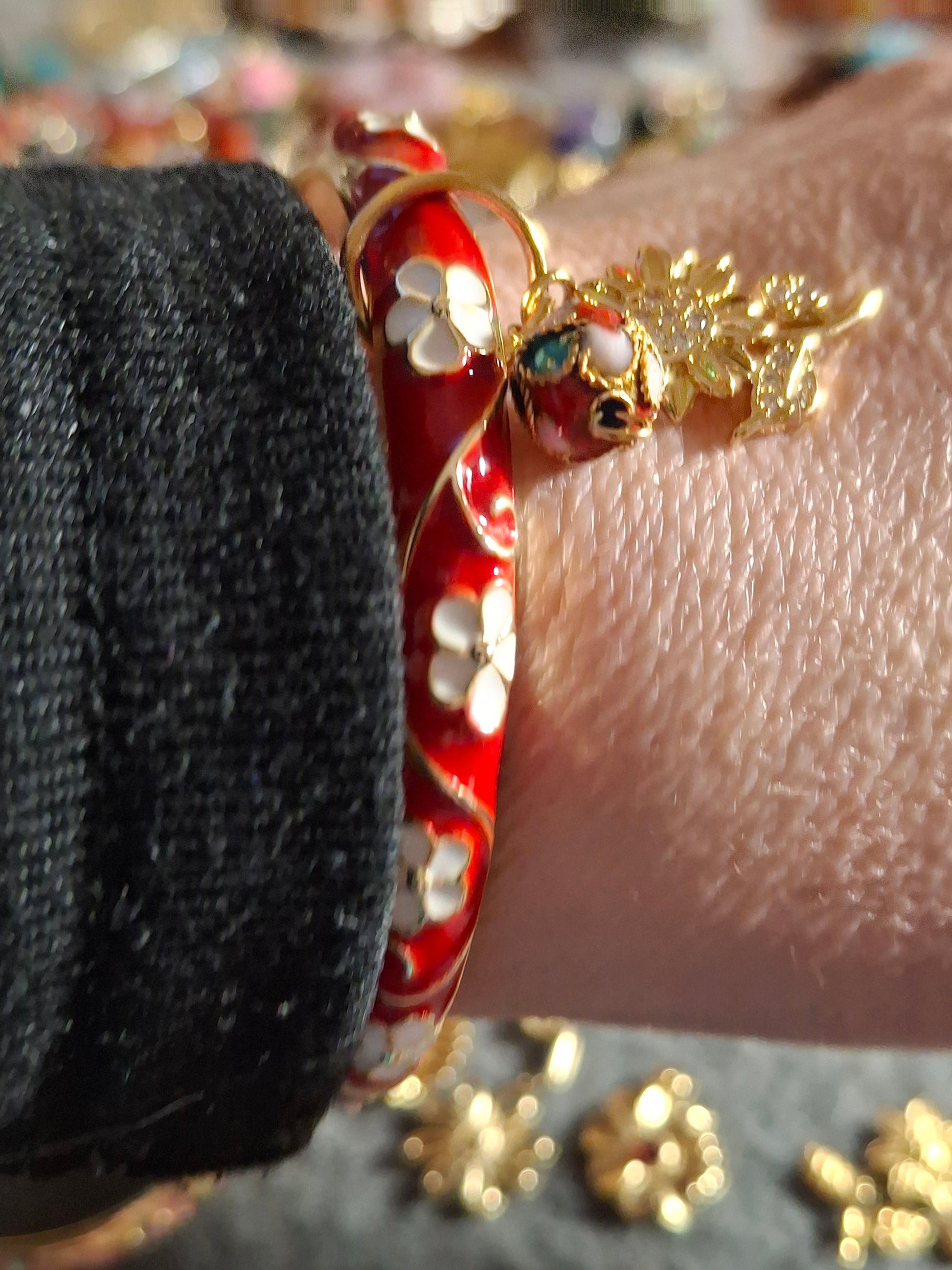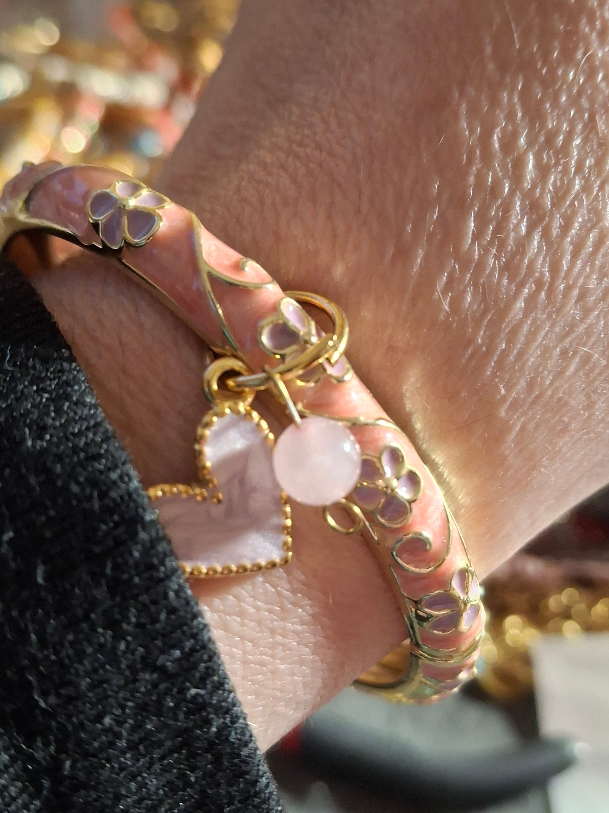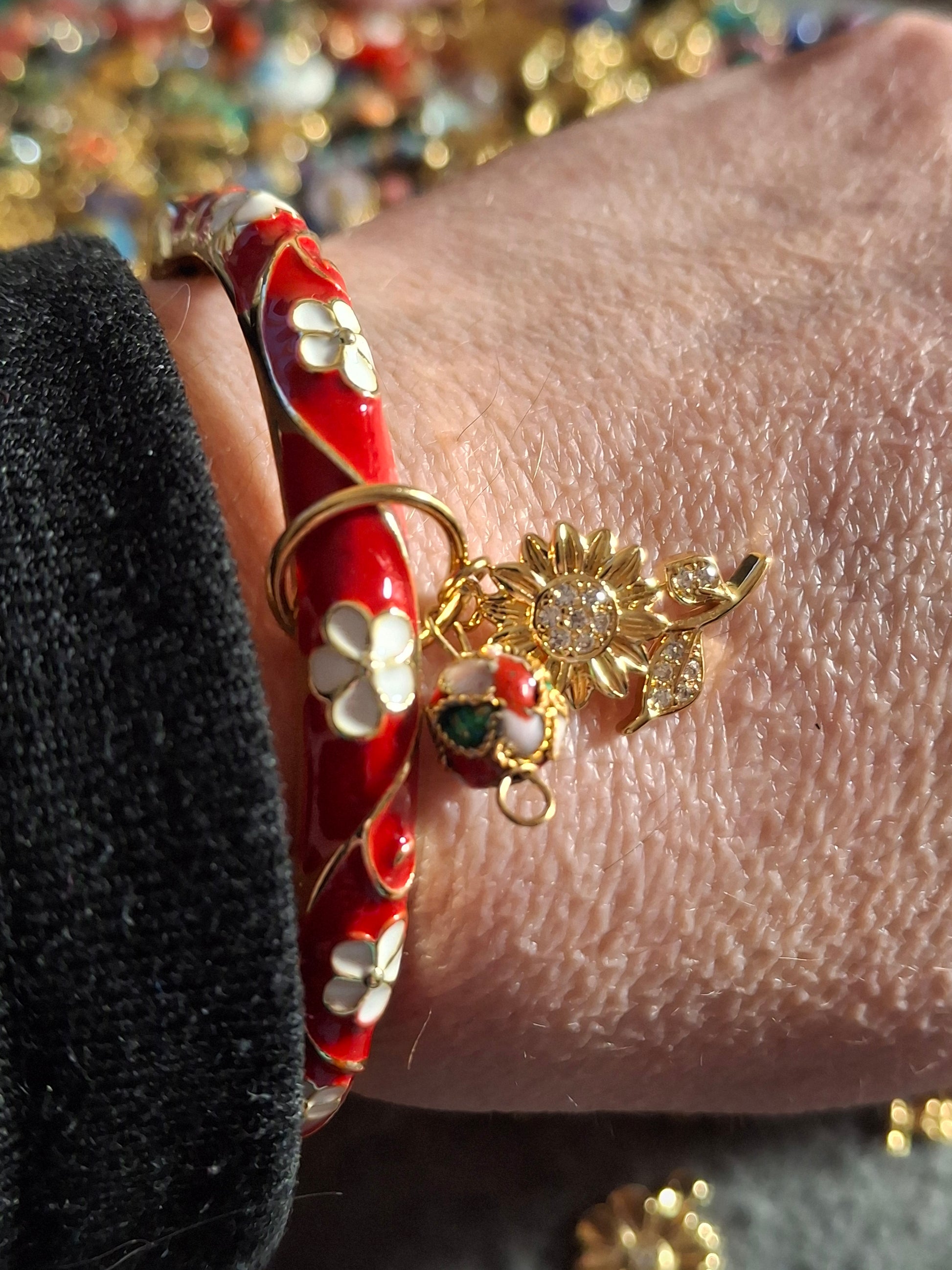 Jonc rigide email cloisonné à ressort motif fleurs breloques