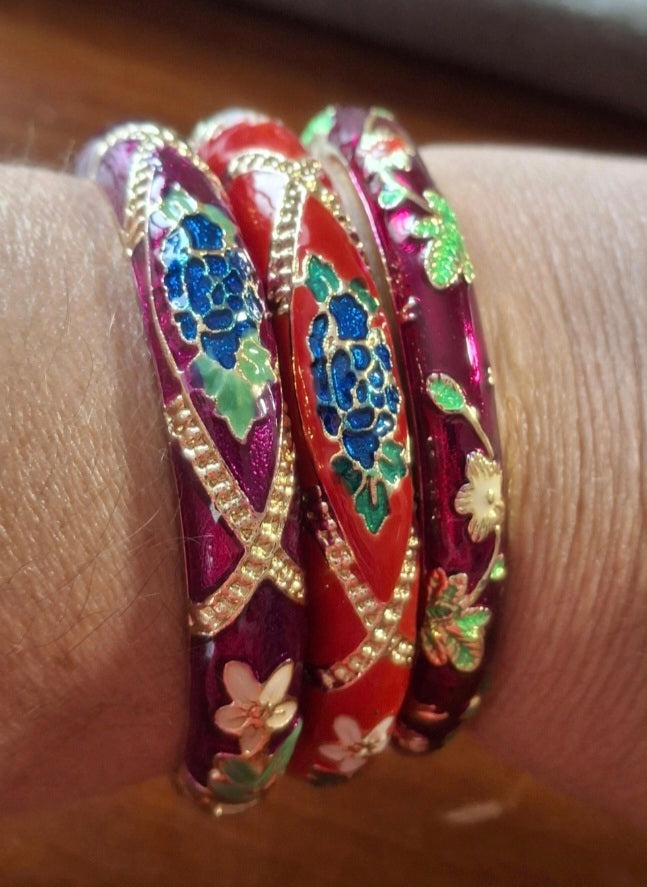 Très joli jonc rigide à ressort style vintage, bohème, email coloré motif petites fleurs doré à l or fin , diamètre 60 mm environ