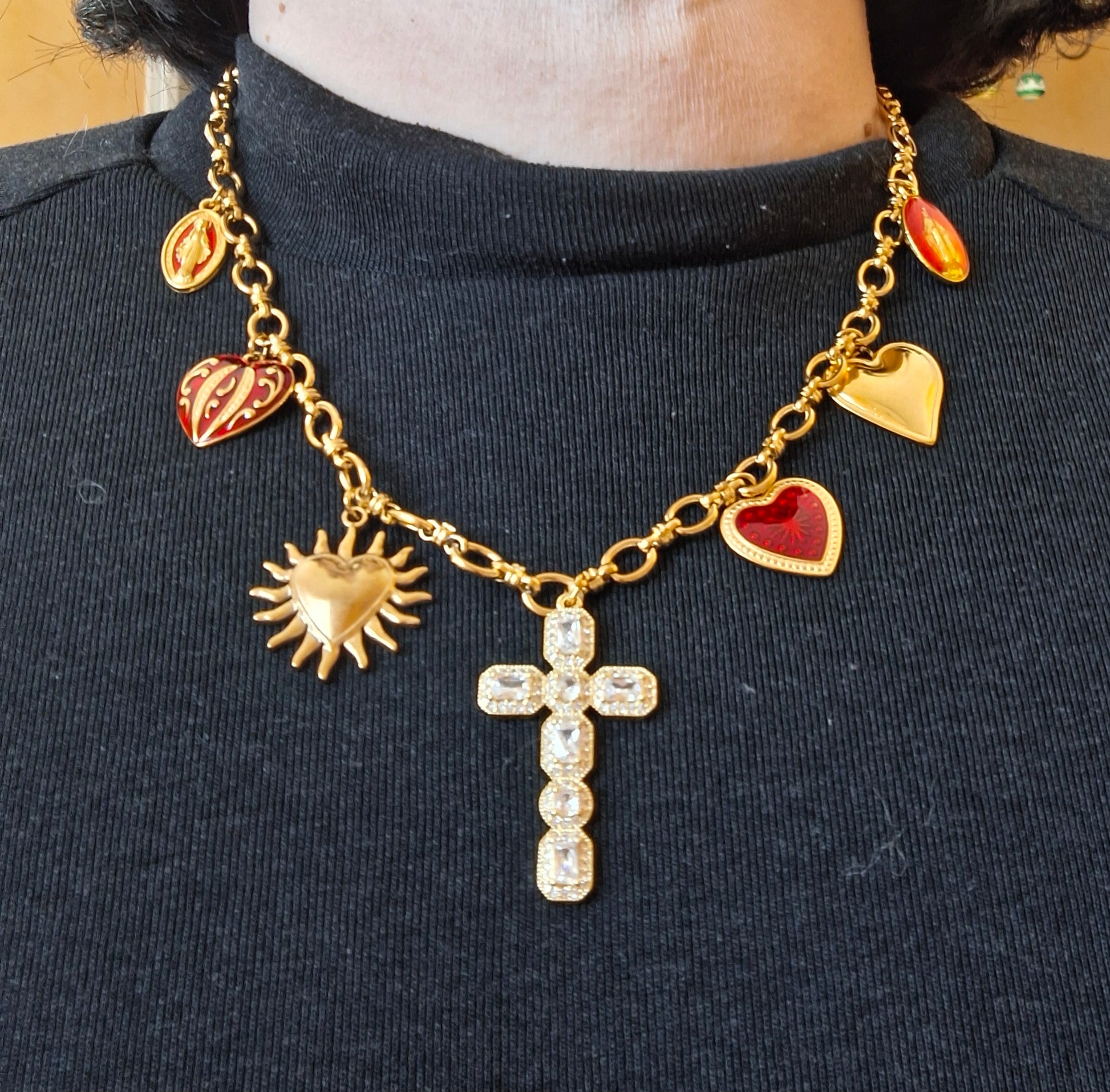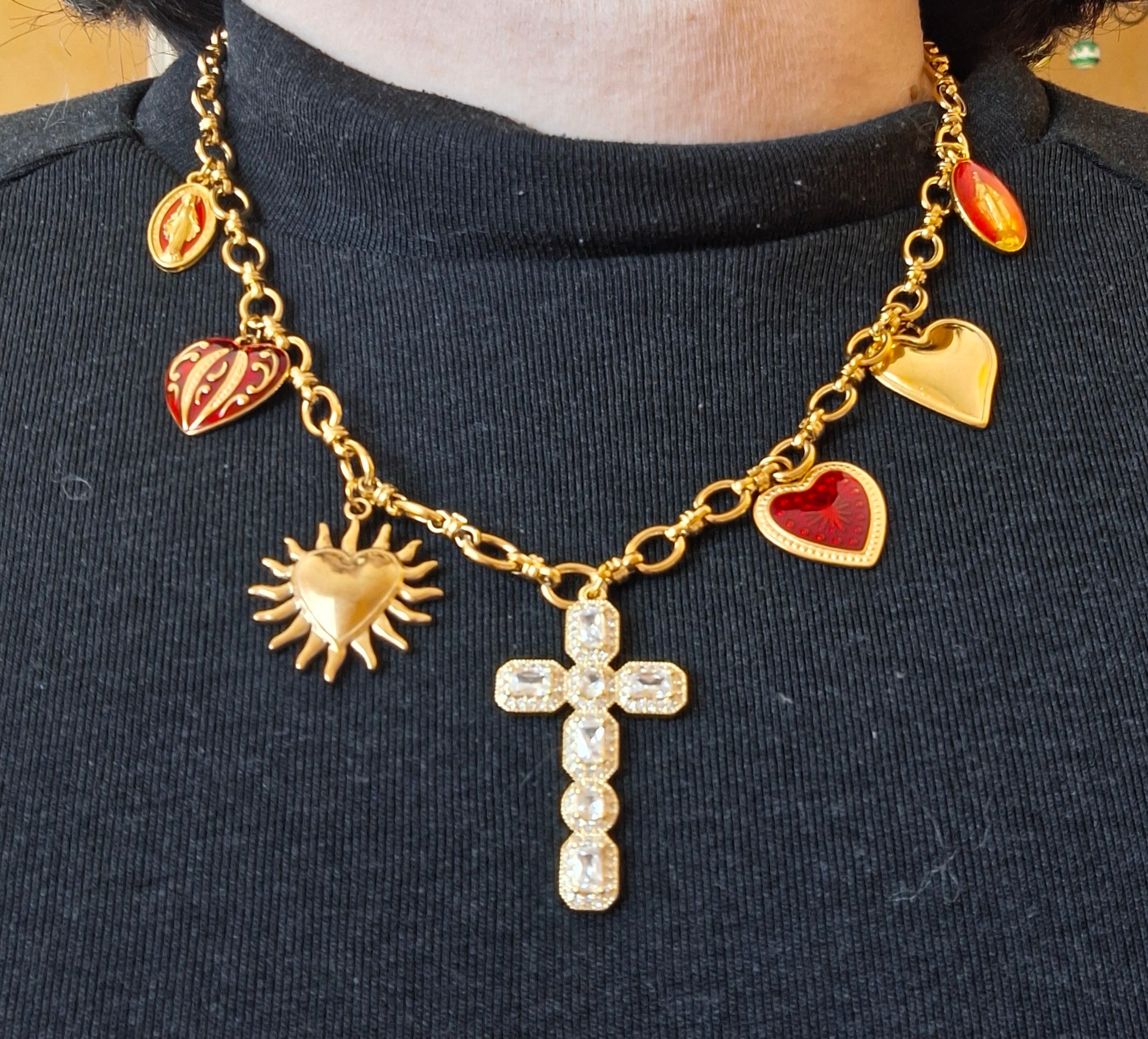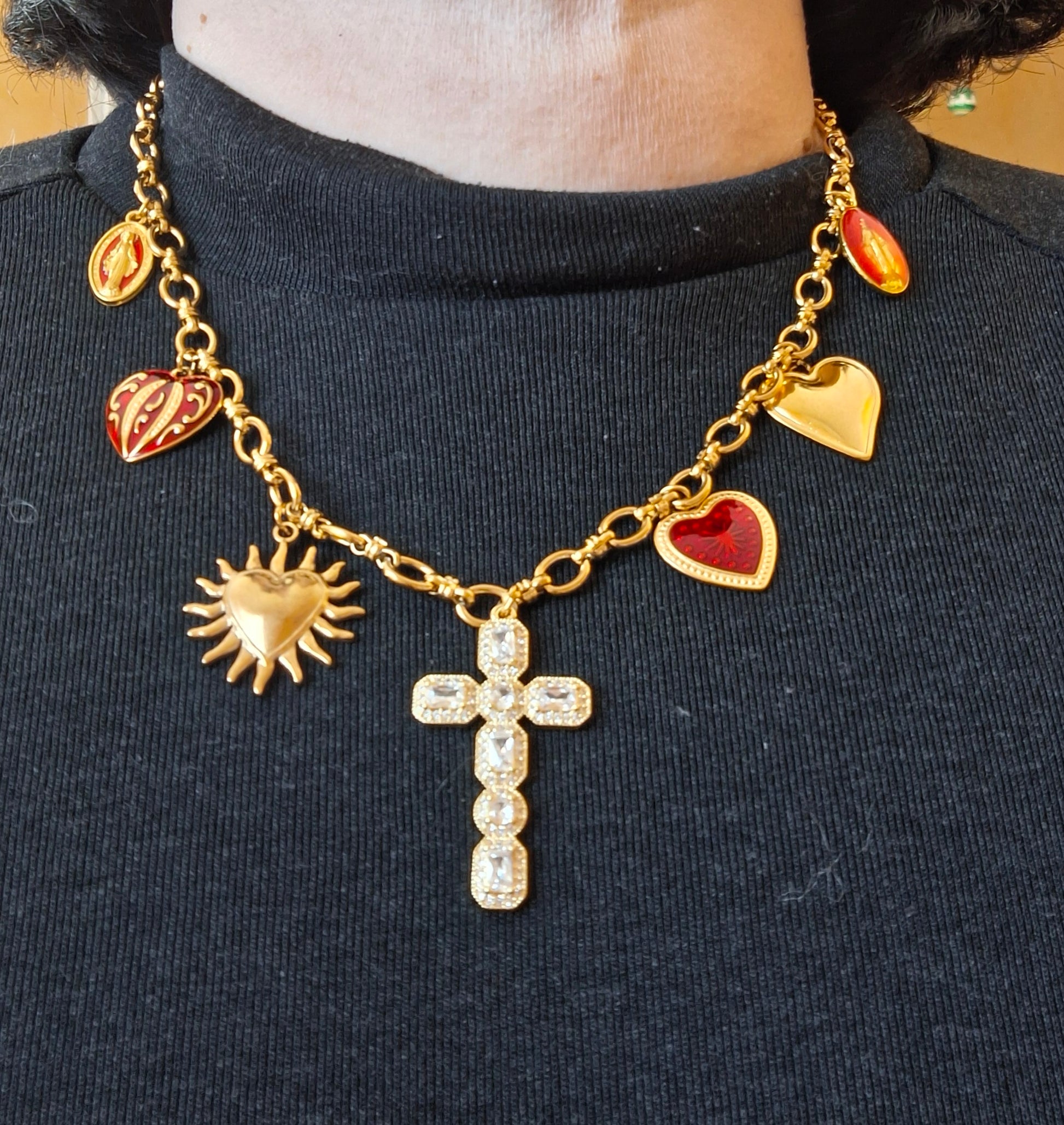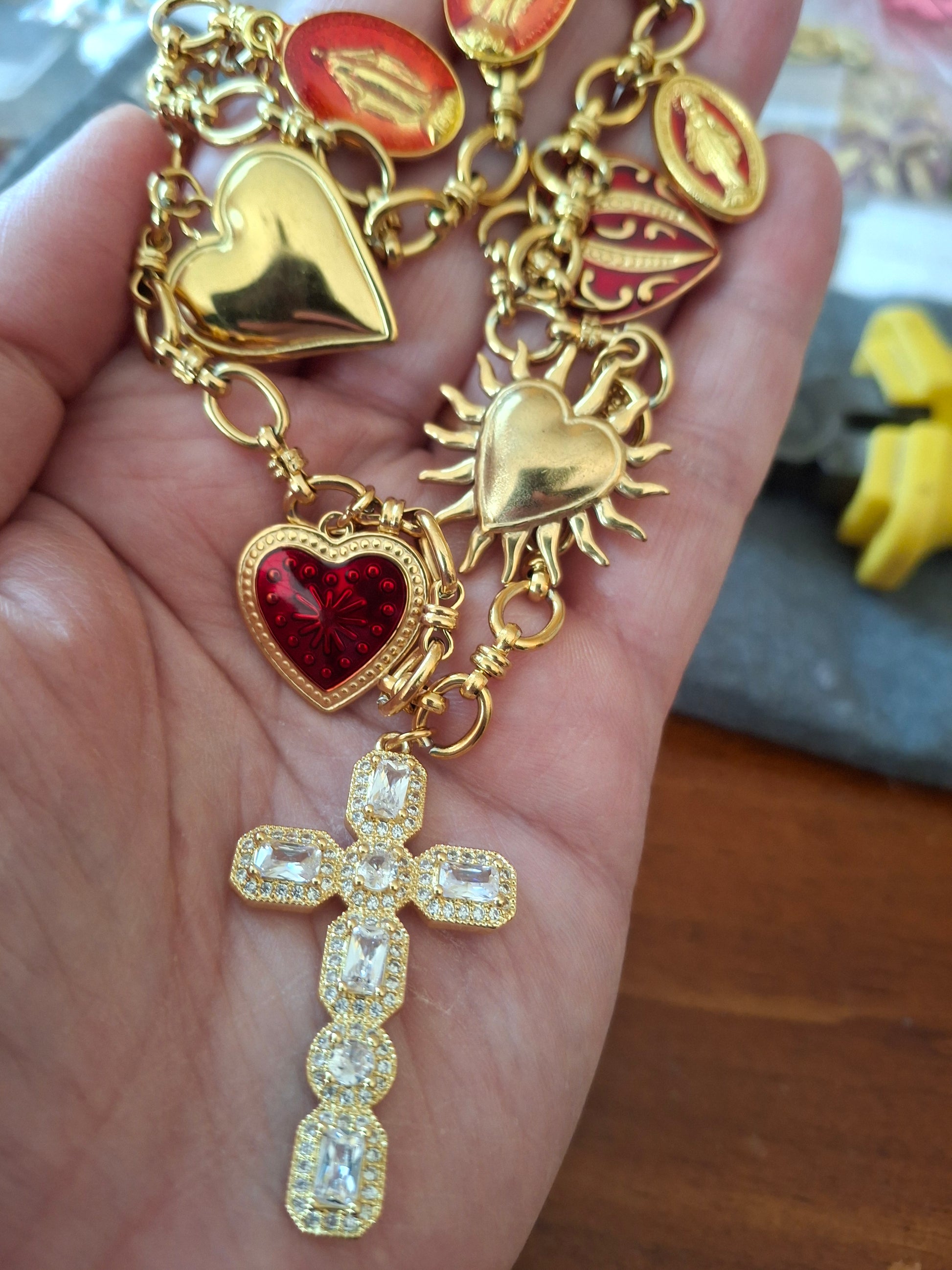 Pendentif grande croix baroque en cuivre plaqué or 18K serti cristal et zirconium AAA austrian handemade, dimensions croix, hauteur 40mm, largeur 25mm et breloques coeurs stainless steel sans nickel cadmium et plomb et médaille madone en cuivre plaqué or et email sans nickel cadmium et plomb