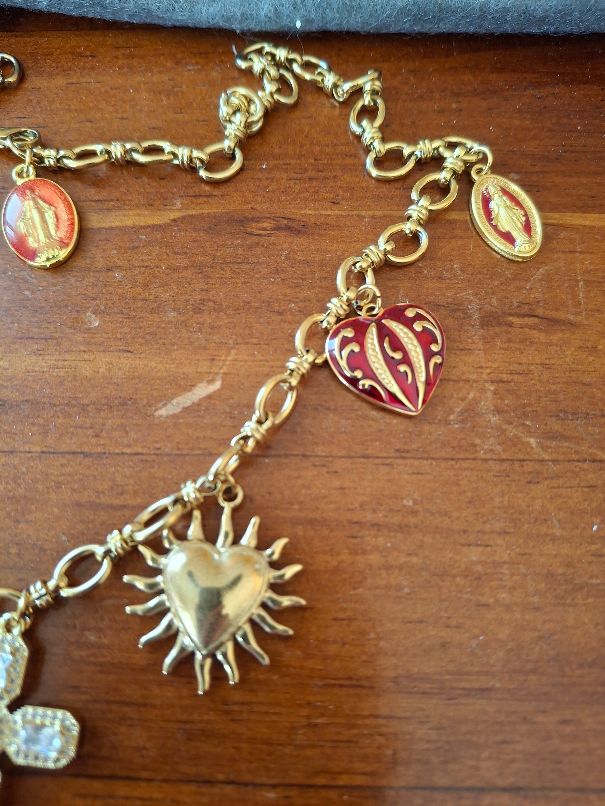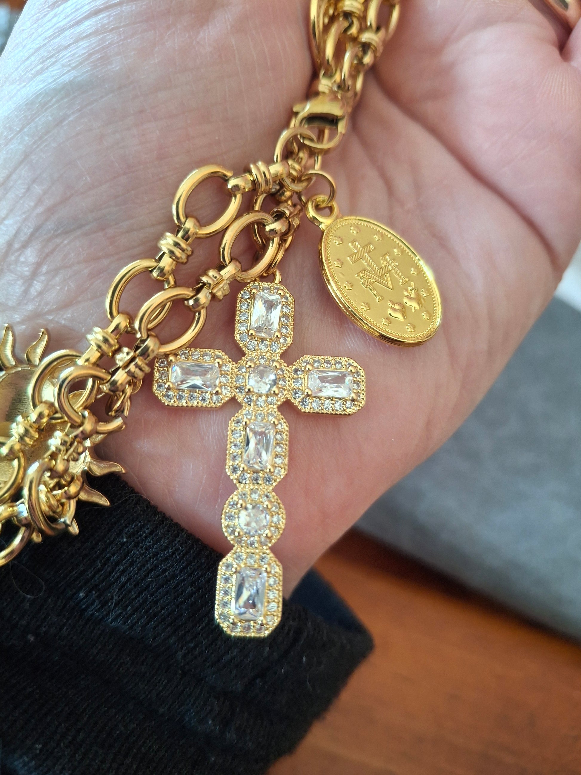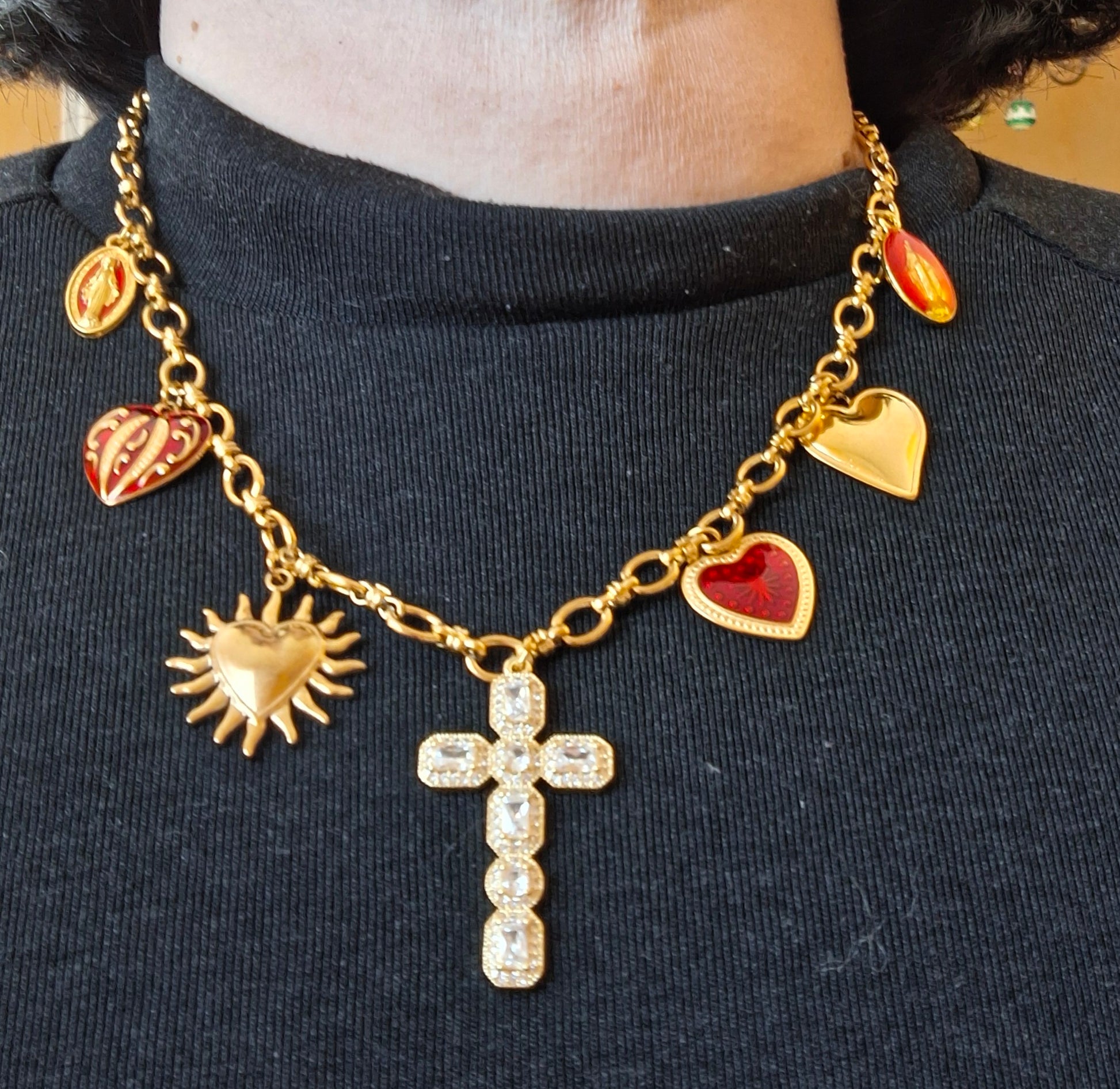 Pendentif grande croix baroque en cuivre plaqué or 18K serti cristal et zirconium AAA austrian handemade, dimensions croix, hauteur 40mm, largeur 25mm et breloques coeurs stainless steel sans nickel cadmium et plomb et médaille madone en cuivre plaqué or et email sans nickel cadmium et plomb