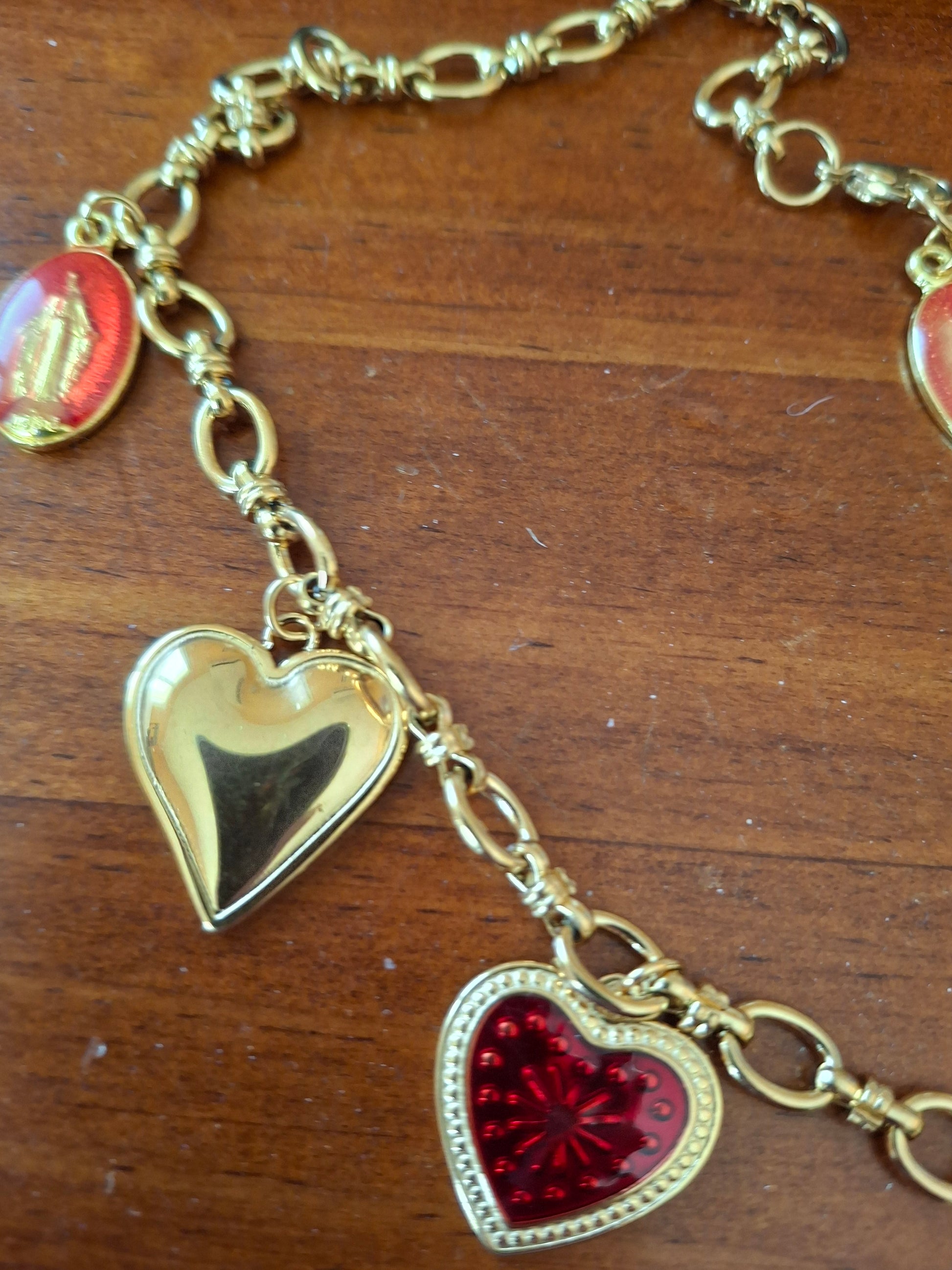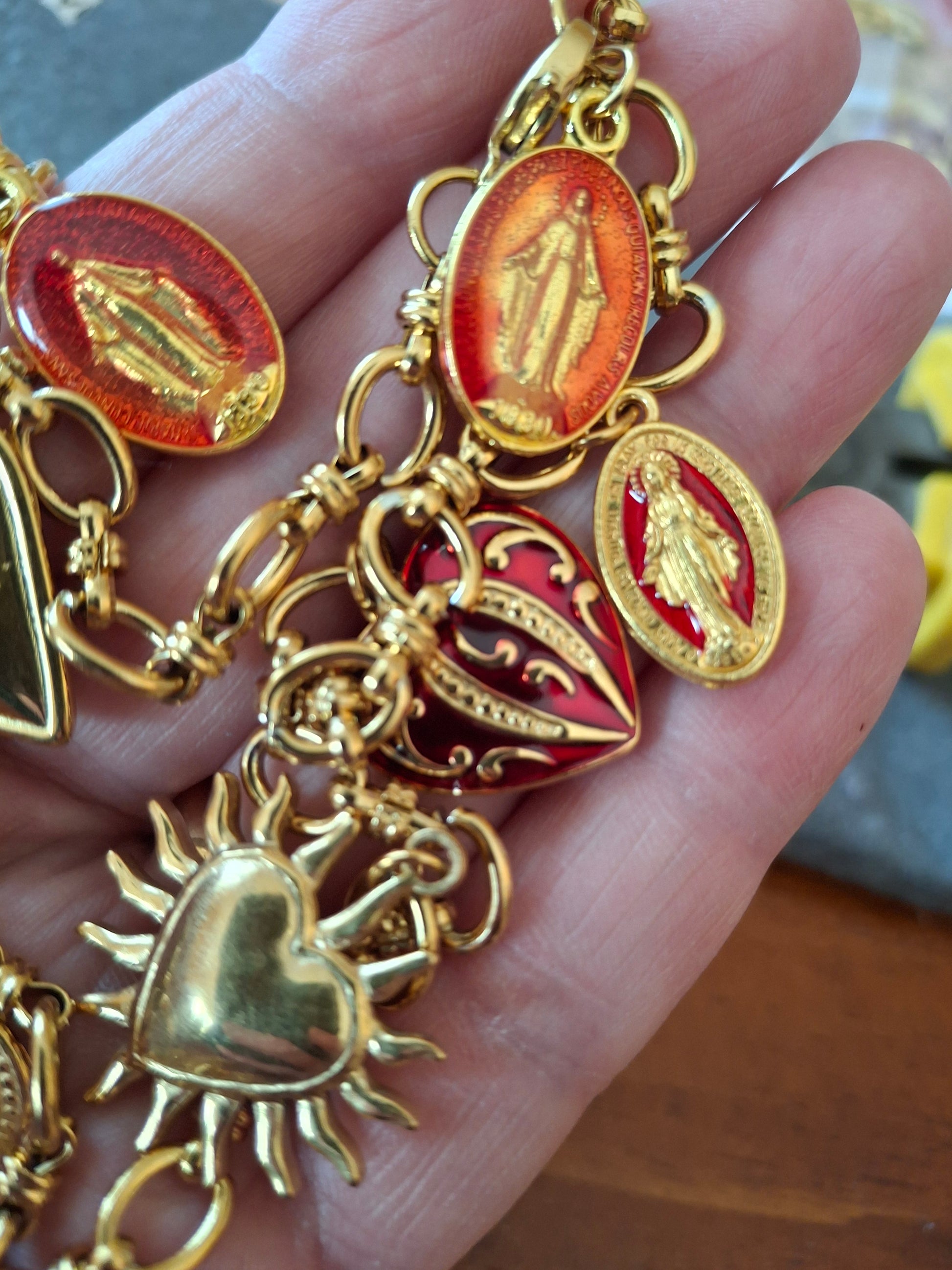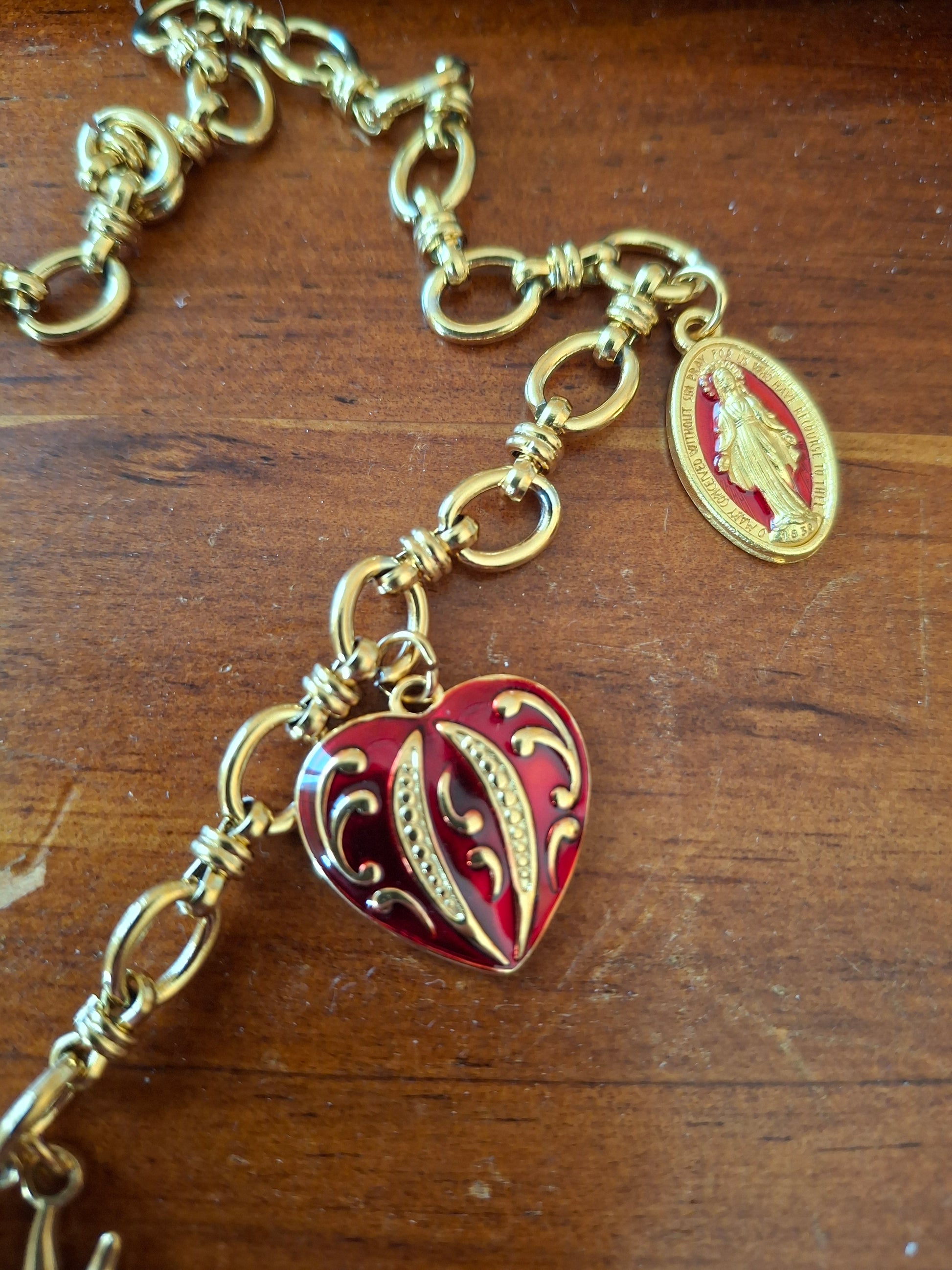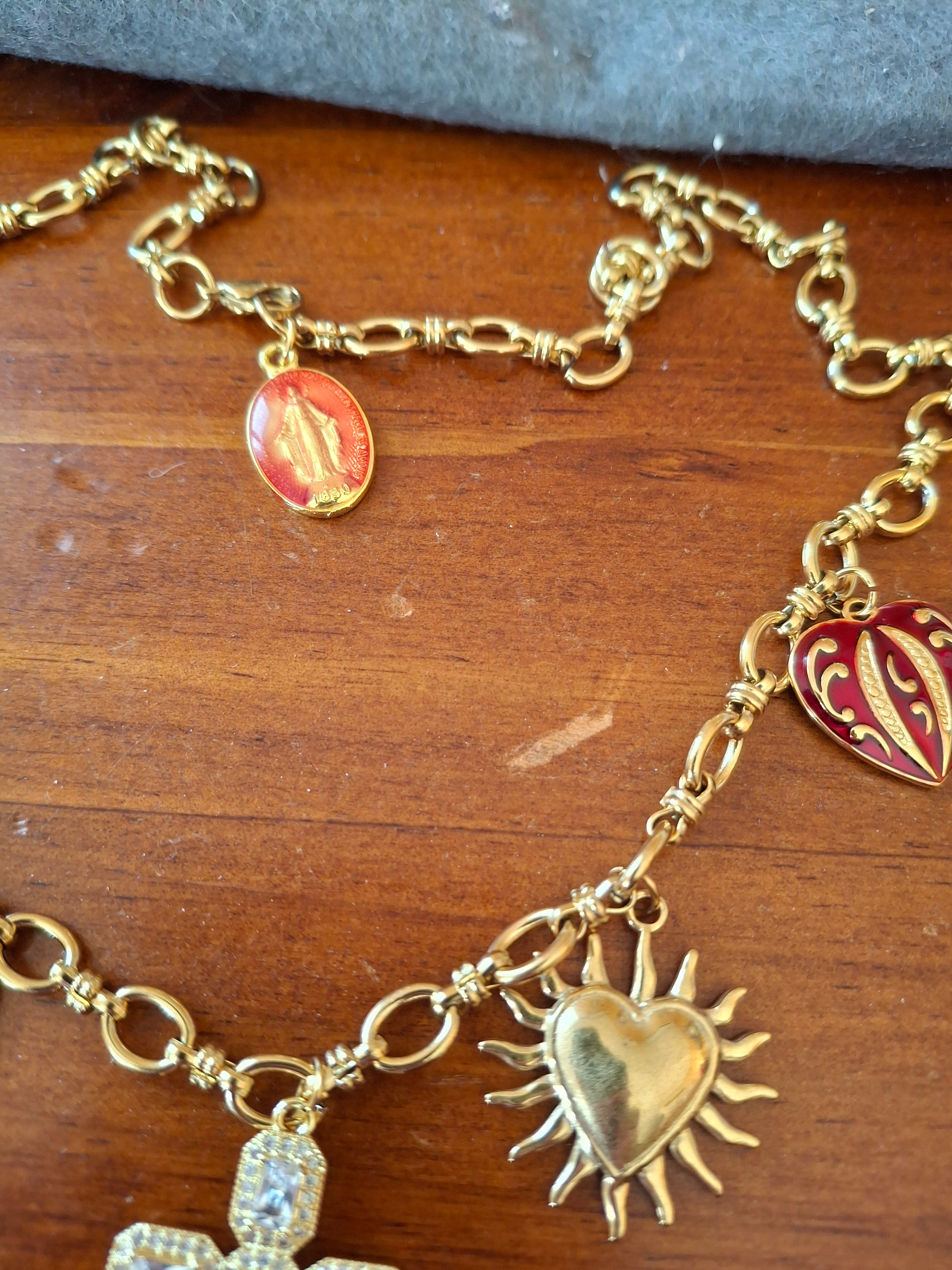 Pendentif grande croix baroque en cuivre plaqué or 18K serti cristal et zirconium AAA austrian handemade, dimensions croix, hauteur 40mm, largeur 25mm et breloques coeurs stainless steel sans nickel cadmium et plomb et médaille madone en cuivre plaqué or et email sans nickel cadmium et plomb