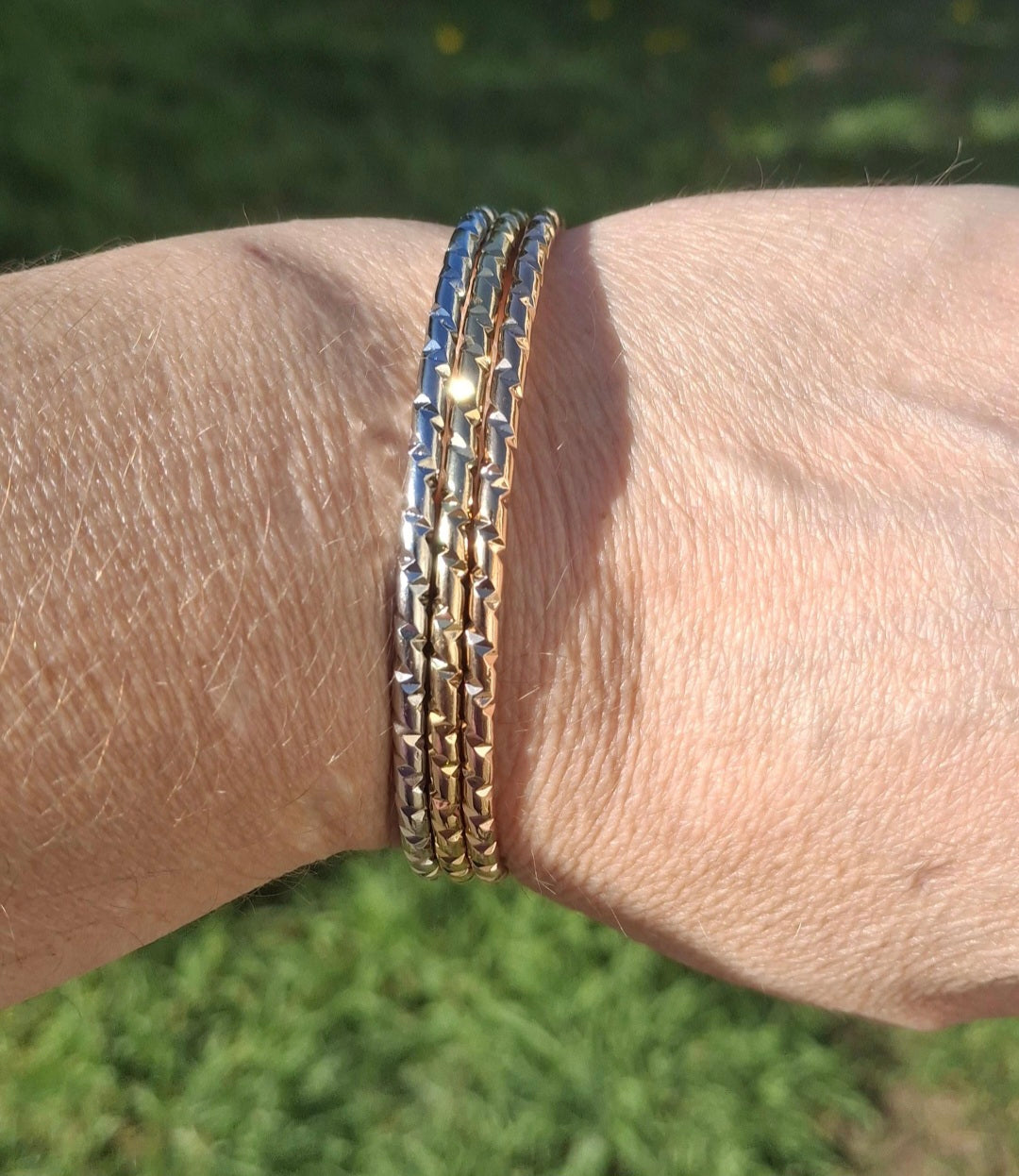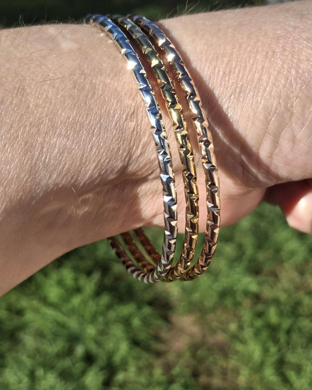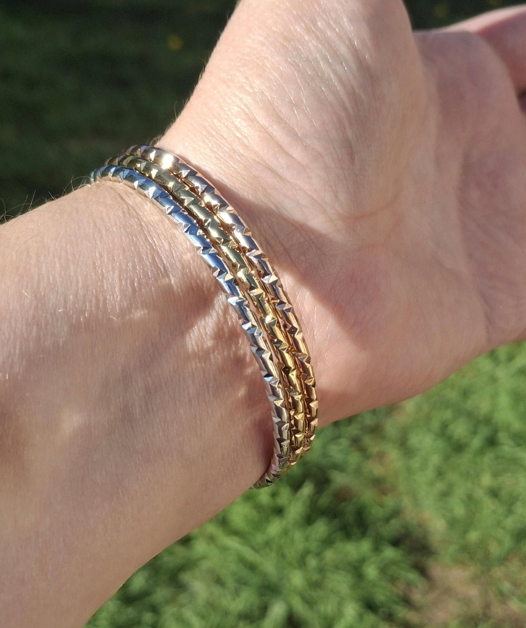 Très joli trio de joncs rigides ,3 couleurs or ,or rose ,argent fermés martelé, style vintage, en acier inoxydable stainless steel 316 de qualité supérieure galvanisation résistante longue durée sans nickel cadmium et plomb, le jonc est plein ,il ne peut pas se tordre, belle épaisseur, il est résistant à l eau, ne rouille pas, ne noircit pas ,très belle qualité