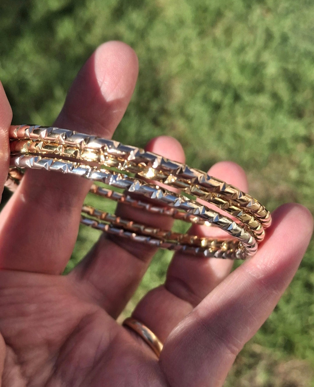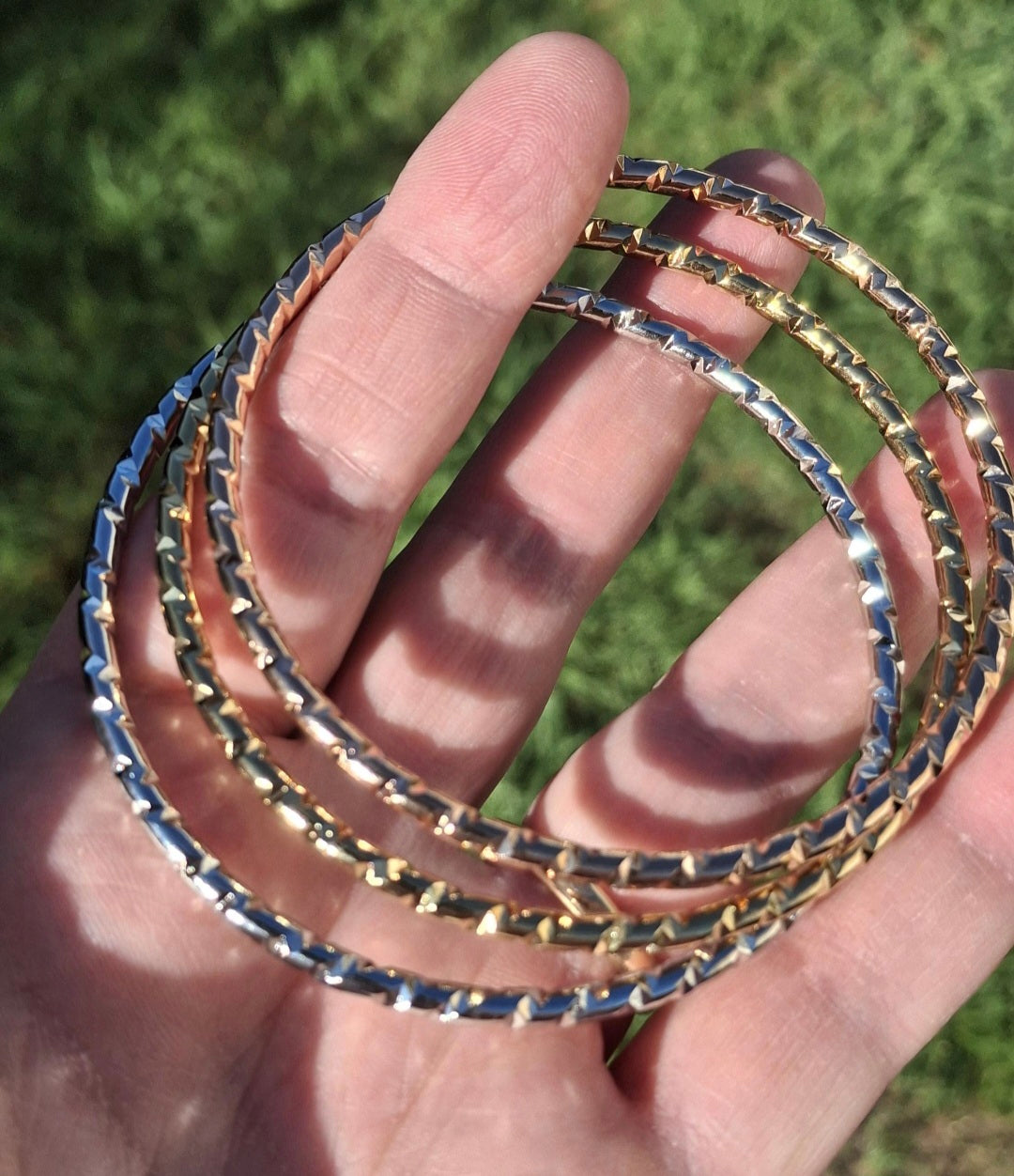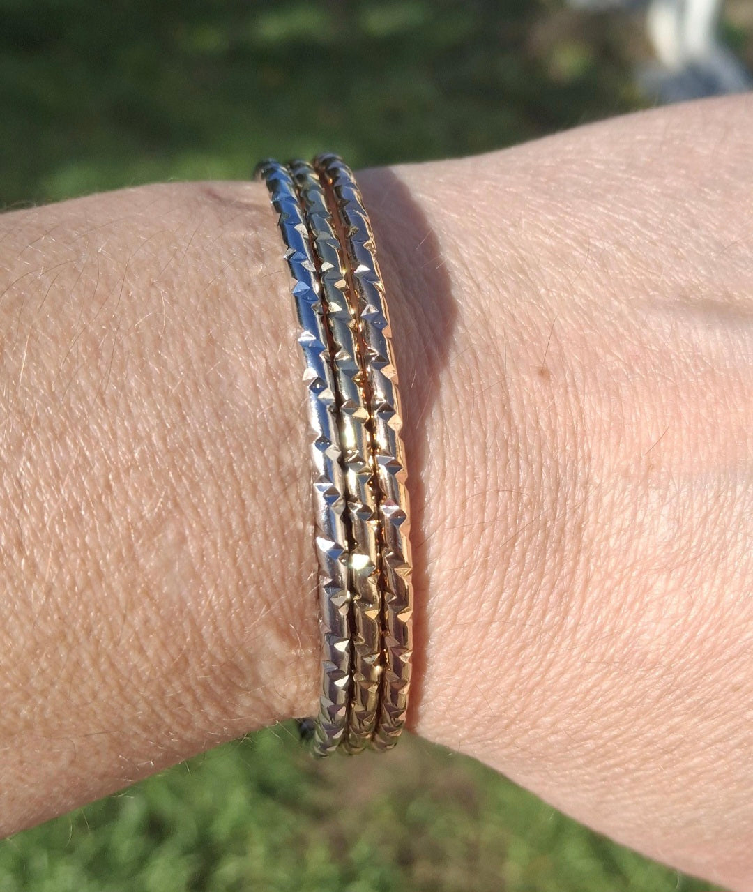 Très joli trio de joncs rigides ,3 couleurs or ,or rose ,argent fermés martelé, style vintage, en acier inoxydable stainless steel 316 de qualité supérieure galvanisation résistante longue durée sans nickel cadmium et plomb, le jonc est plein ,il ne peut pas se tordre, belle épaisseur, il est résistant à l eau, ne rouille pas, ne noircit pas ,très belle qualité